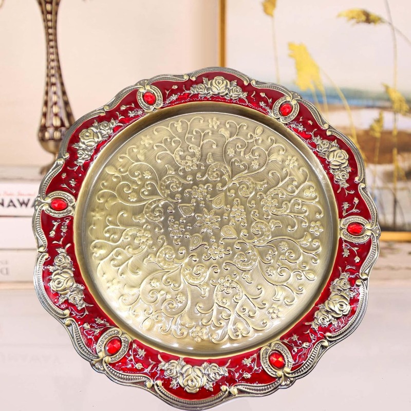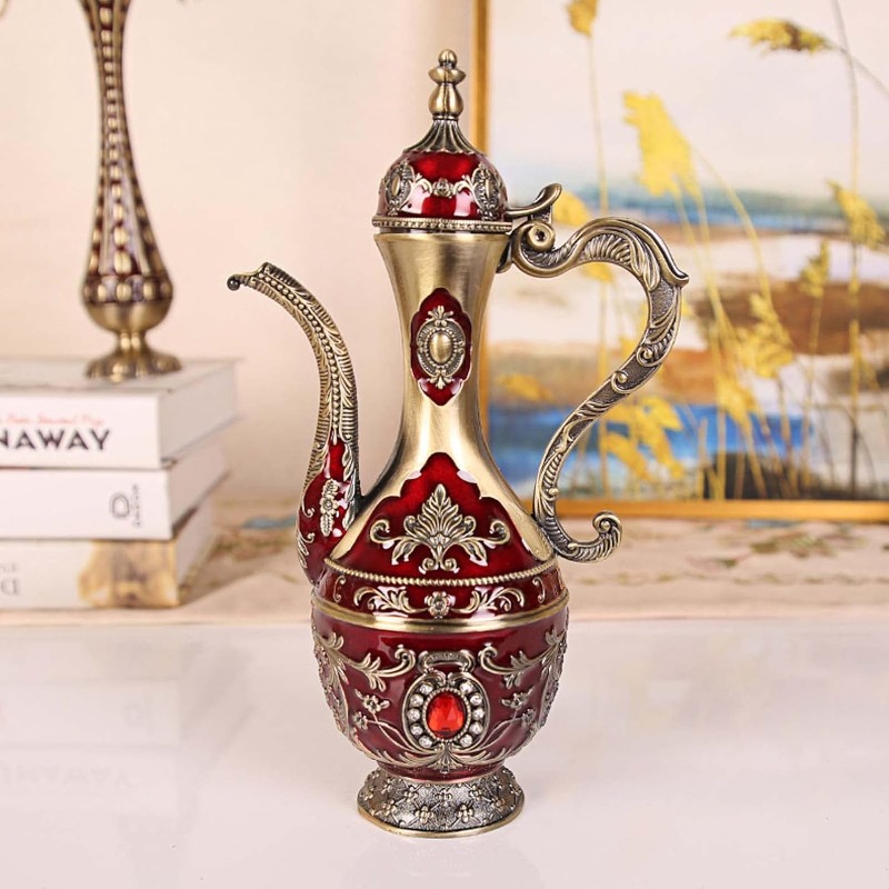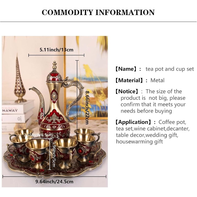 Llévate a casa un toque de elegancia con nuestro juego de cafetera y taza turca. Con 6 tazas y una bandeja para servir, todo en metal decorado con diamantes de imitación. Además, su estilo antiguo rojo y dorado te hará sentir como en un verdadero palacio. ¡Puro lujo y funcionalidad en un solo producto!