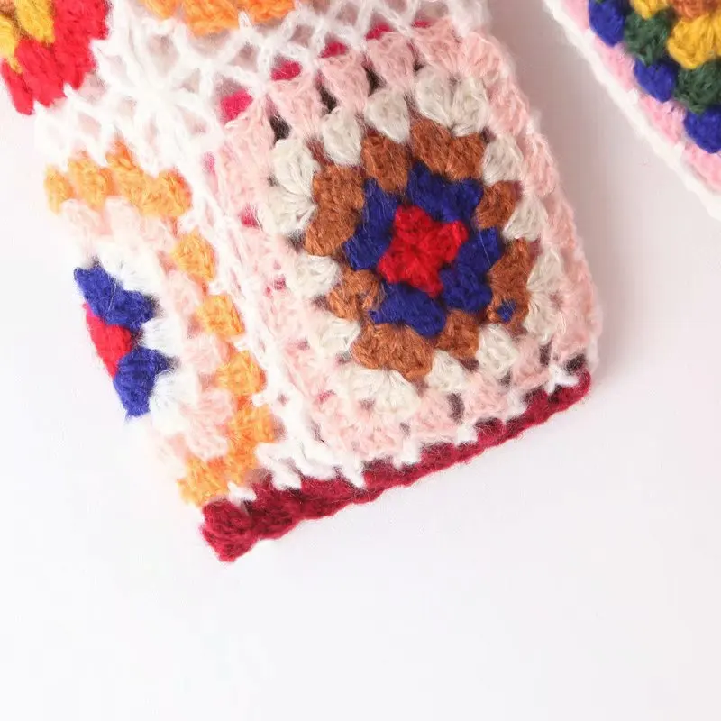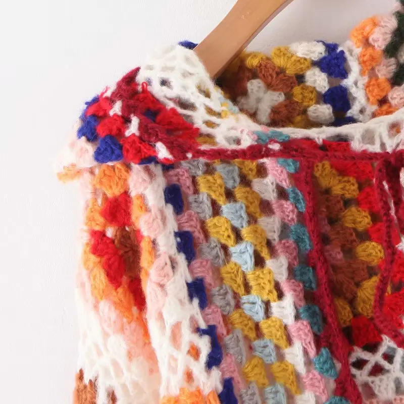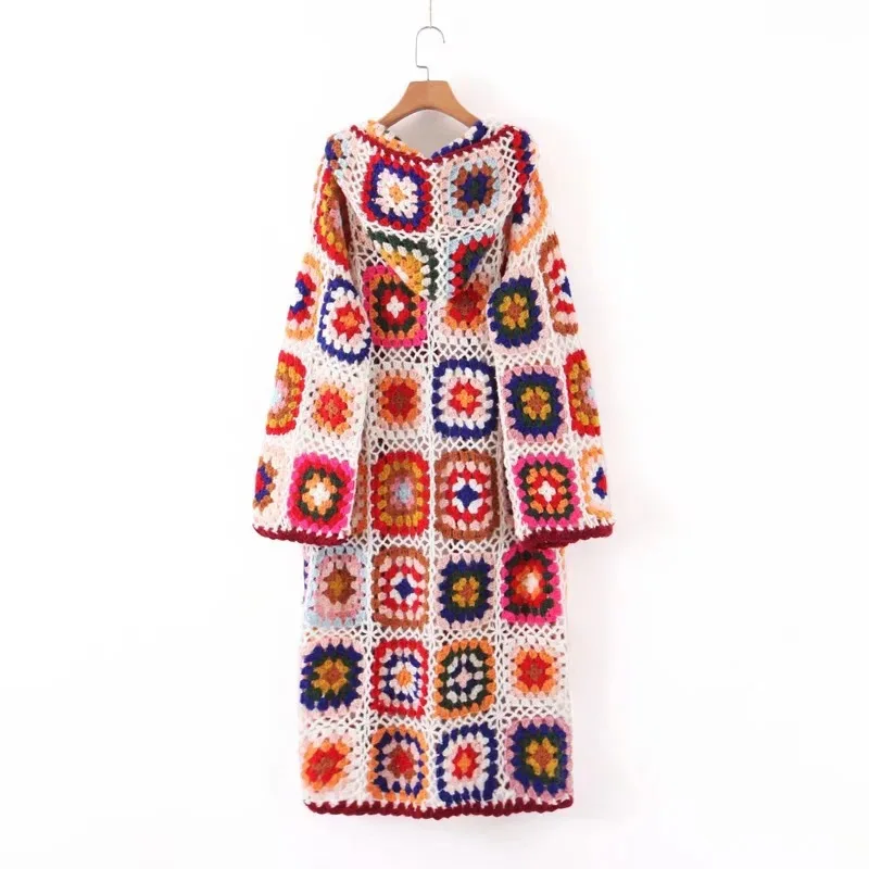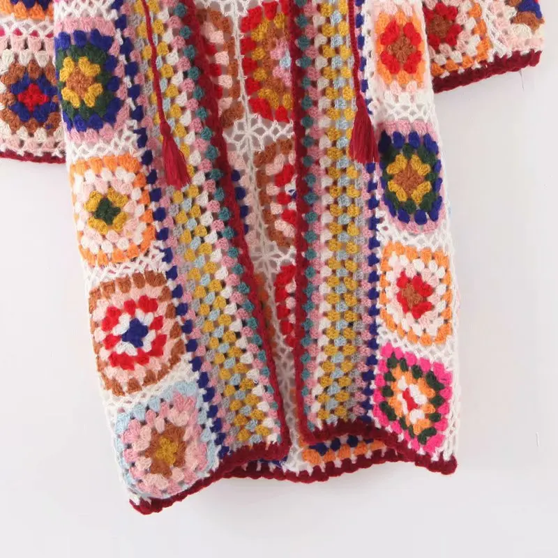 Cárdigan con capucha de ganchillo hecho a mano con flores a cuadros de colores bohemios