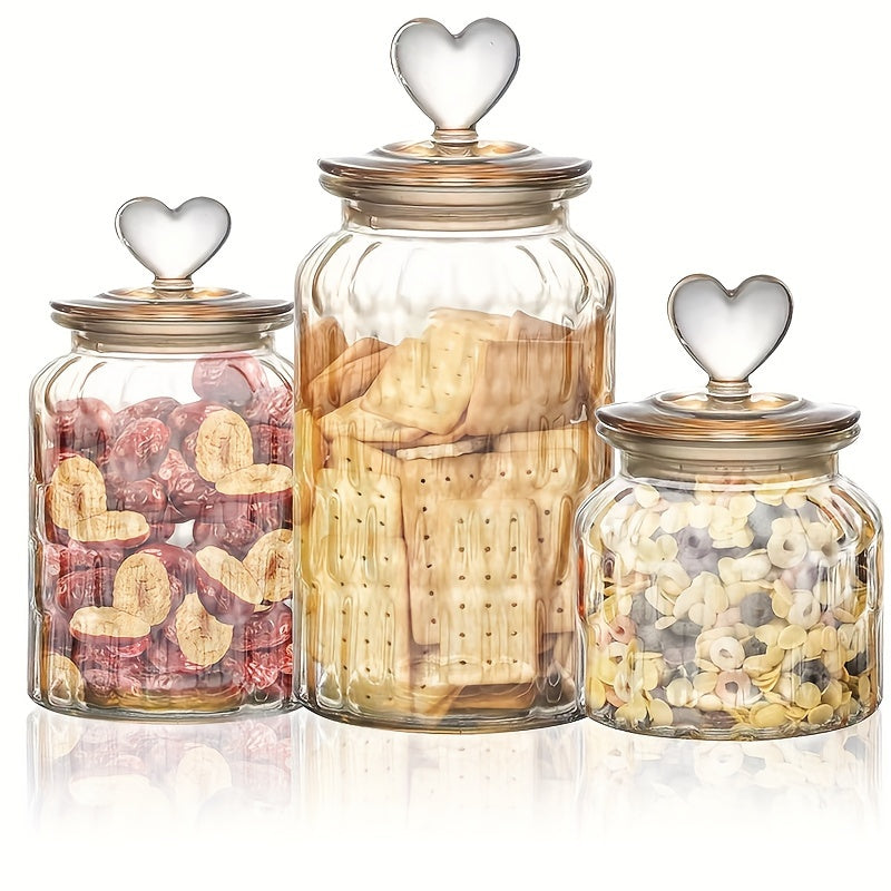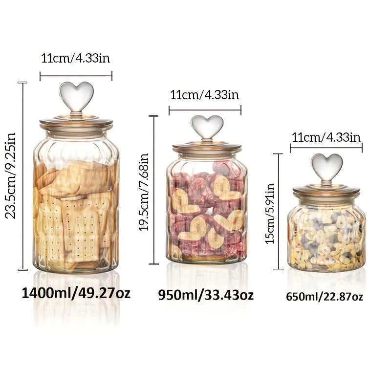 Almacena tus alimentos favoritos de manera segura y organizada con nuestros tarros de almacenamiento de vidrio herméticos. Vienen en un set de 3/2 piezas y tienen una capacidad de 650ml-1400ml. Ideales para almacenar azúcar, harina, granos, café, especias y cereales. Mantén tu cocina ordenada y tus alimentos frescos por más tiempo.