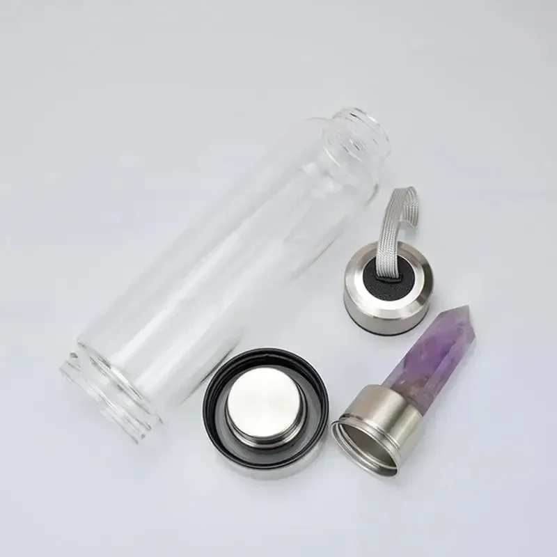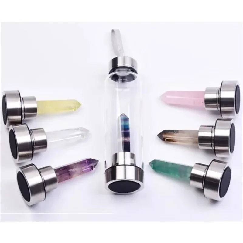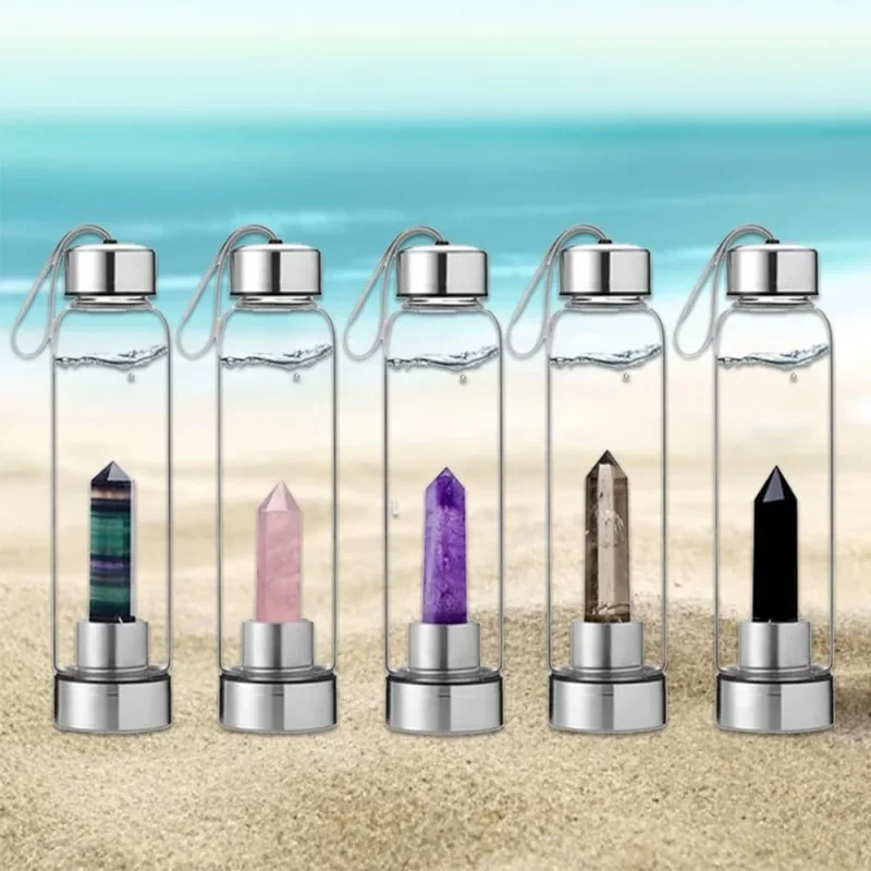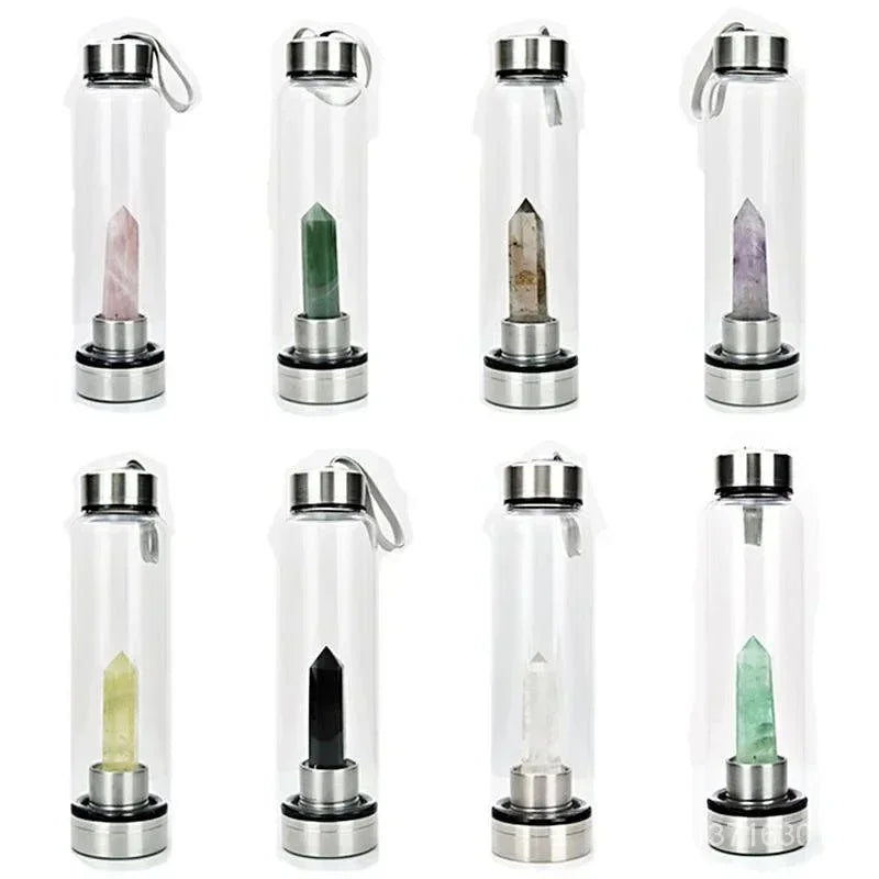 Mejora tu bienestar con nuestra botella de agua con piedra de cristal natural. Con cristal de cuarzo y gemas de colores, cada trago se convertirá en una experiencia única. Escoge tu estilo y eleva tu hogar con esta botella de agua elegante y funcional. Hidratarse nunca había sido tan beneficioso.