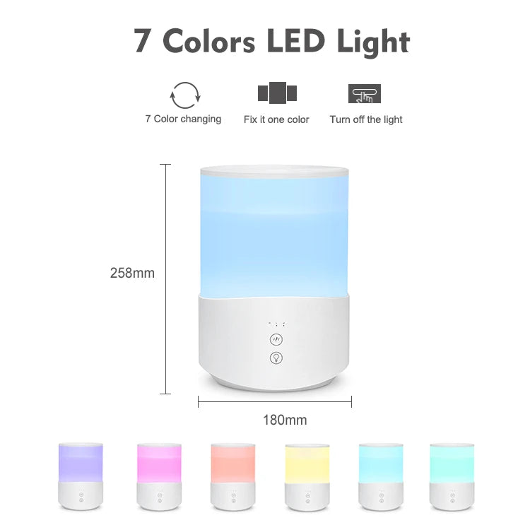 Aromacare humidificador ultrasónico con 7 luces led para crear un ambiente relajante y mejorar la calidad del aire. Funciona silenciosamente y puede ayudar a reducir la sequedad en el hogar, promoviendo un mejor sueño y bienestar en general. Perfecto para cualquier habitación de la casa