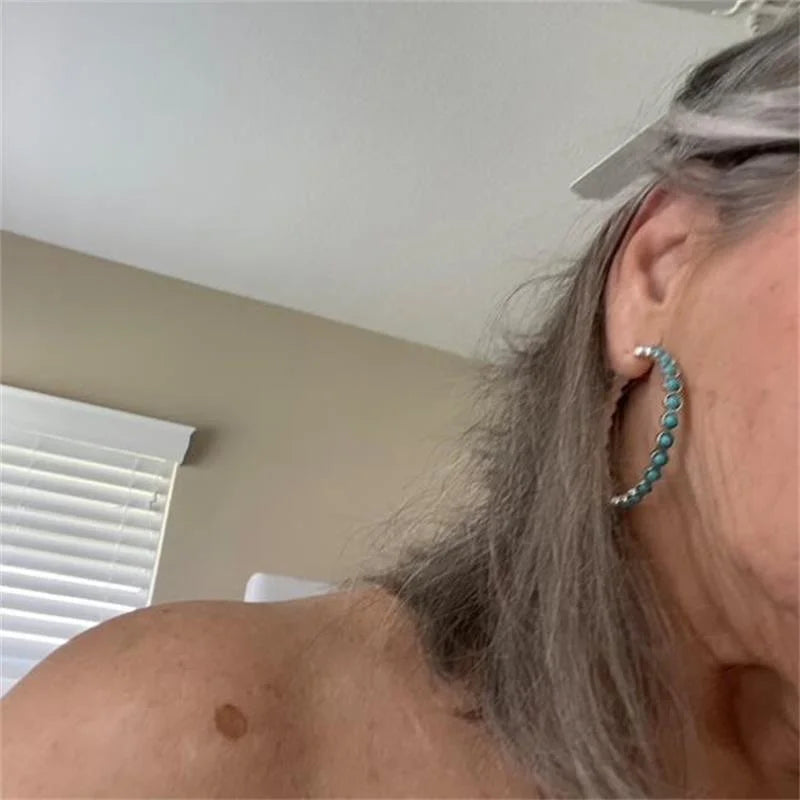 Pendientes turquesa de Bohemia, gran pendiente de aro redondo de color plateado