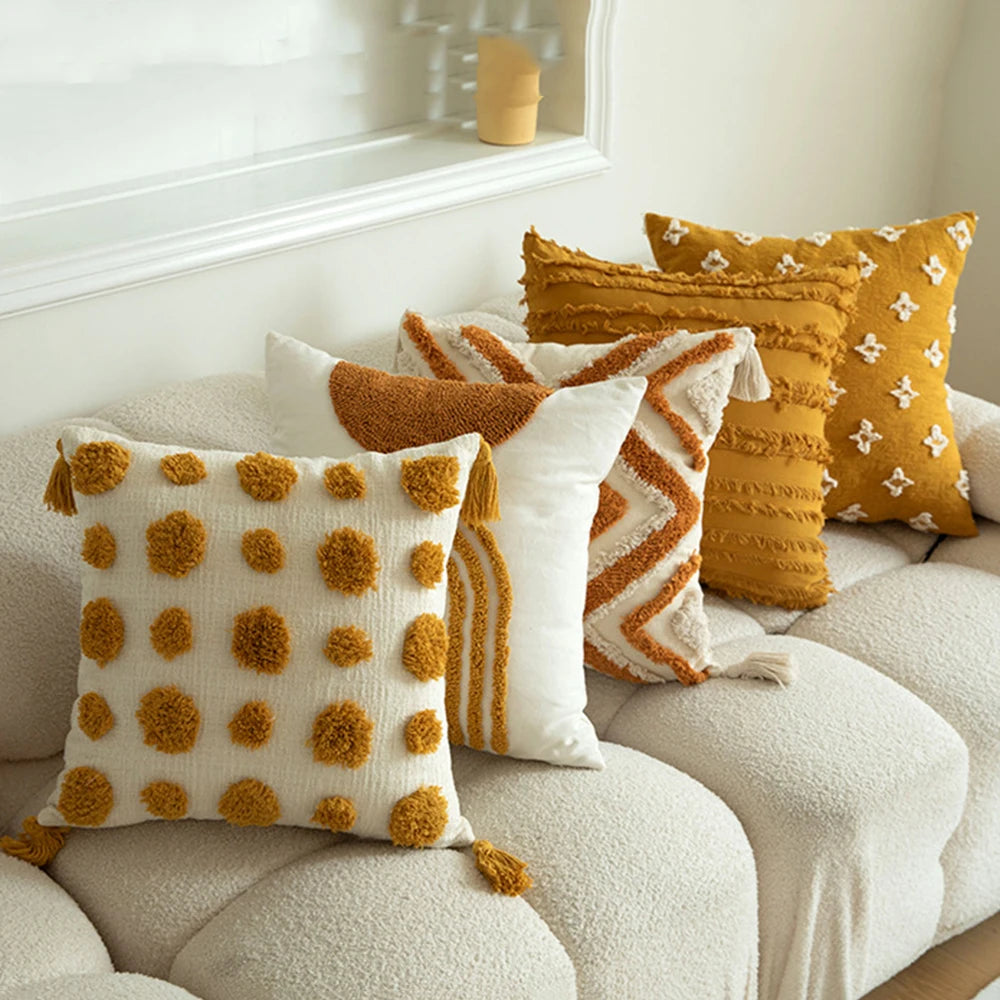 Esta funda de cojín Boho de 45x45 cuenta con un hermoso diseño jacquard bordado y detalles de borlas, lo que la convierte en una adición elegante y bohemia a tu decoración del hogar. Hecha de materiales de alta calidad, esta funda ofrece comodidad y estilo para complementar cualquier espacio.