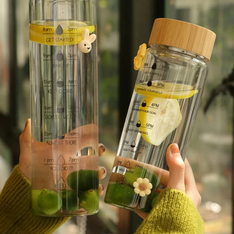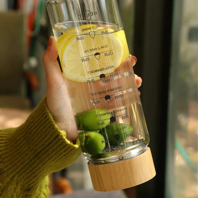 Botella de agua de vidrio de 700ML con escala de tiempo y taza de vidrio con filtro de té de acero inoxidable