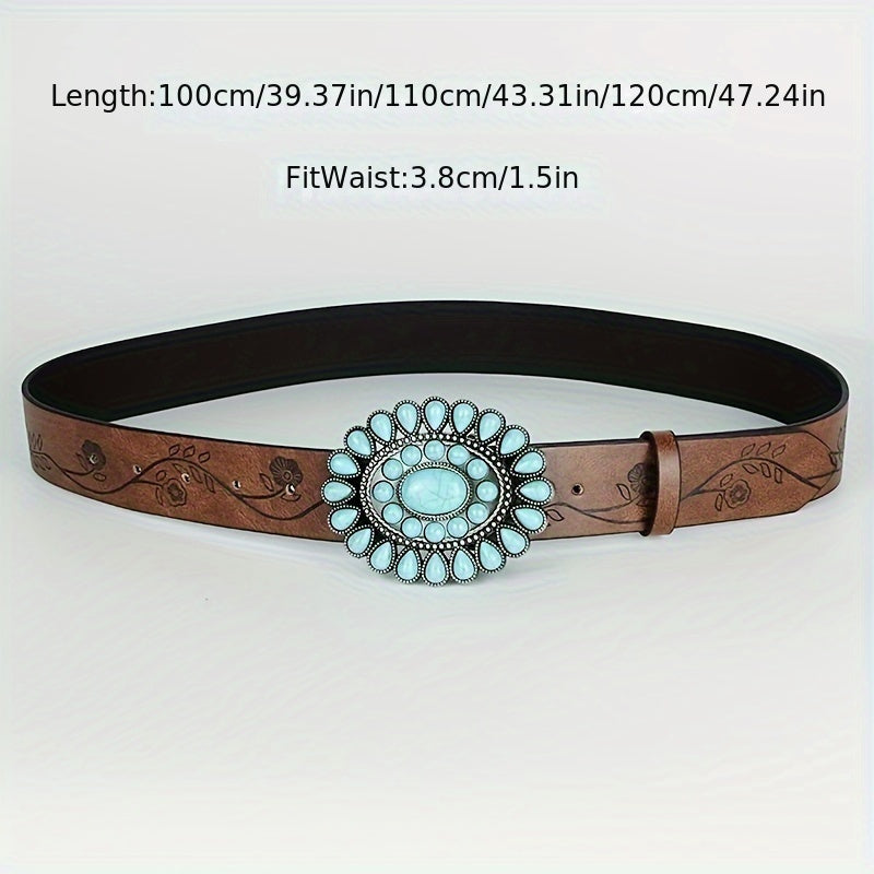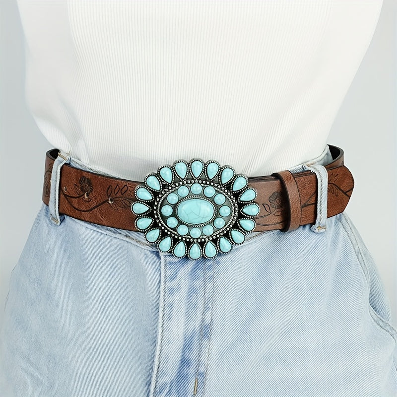 Cinturón turquesa boho- Hebilla ovalada, cintura de cuero en relieve marrón vintage