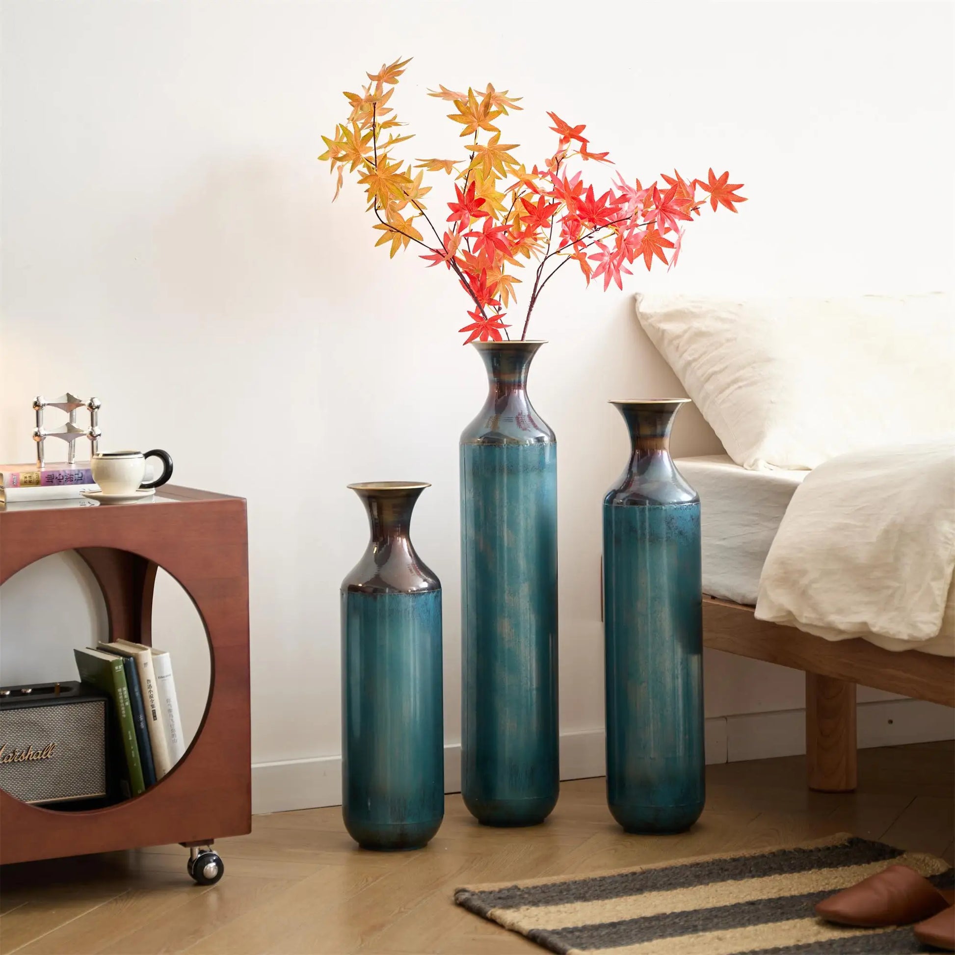 Experimenta la belleza y la funcionalidad con este juego de 3 jarrones de metal azul de piso. Hechos con materiales duraderos, estos jarrones son una adición impresionante a cualquier espacio. Con su color azul vibrante y su diseño elegante, estos jarrones seguramente atraerán todas las miradas y agregarán un toque moderno a tu hogar.