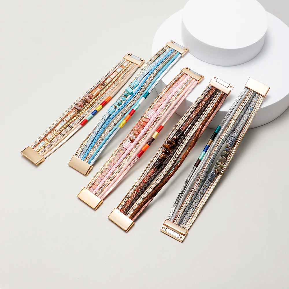 Estas pulseras son una excelente opción para quienes buscan un accesorio elegante y natural. Las cuentas de piedra natural están hechas a mano y ofrecen propiedades beneficiosas para la salud, como la relajación y el equilibrio. Añade un toque de estilo y bienestar a tu look con estas bellas pulseras.