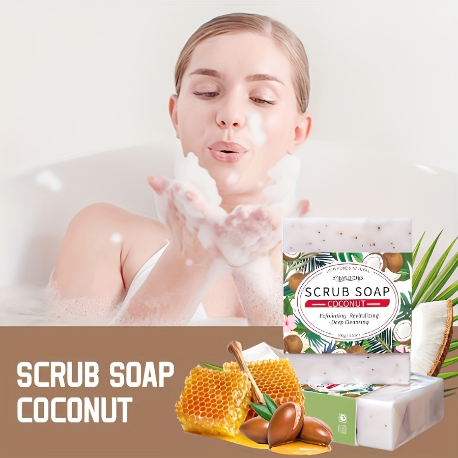 Jabón exfoliante de coco, enriquecidos con coco, manteca de karité y manteca de leche de cabra, limpian en profundidad y nutren la cara y el cuerpo, hidratan y suavizan la piel, no irritante.