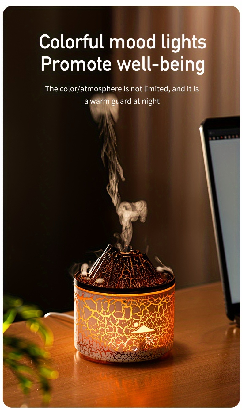 Difusor de aceites esenciales de volcán con luz colorida, humidificador de aire USB